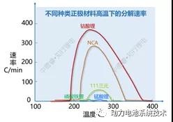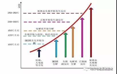 鋰離子電池?zé)岱磻?yīng),100℃左右時,SEI開始分解,120℃左右時,負(fù)極開始與溶劑,粘接劑反應(yīng),150℃左右時,電解質(zhì)開始分解,200℃-300℃開始發(fā)生副反應(yīng),250℃-350℃時,嵌鋰態(tài)負(fù)極開始發(fā)生反應(yīng)。